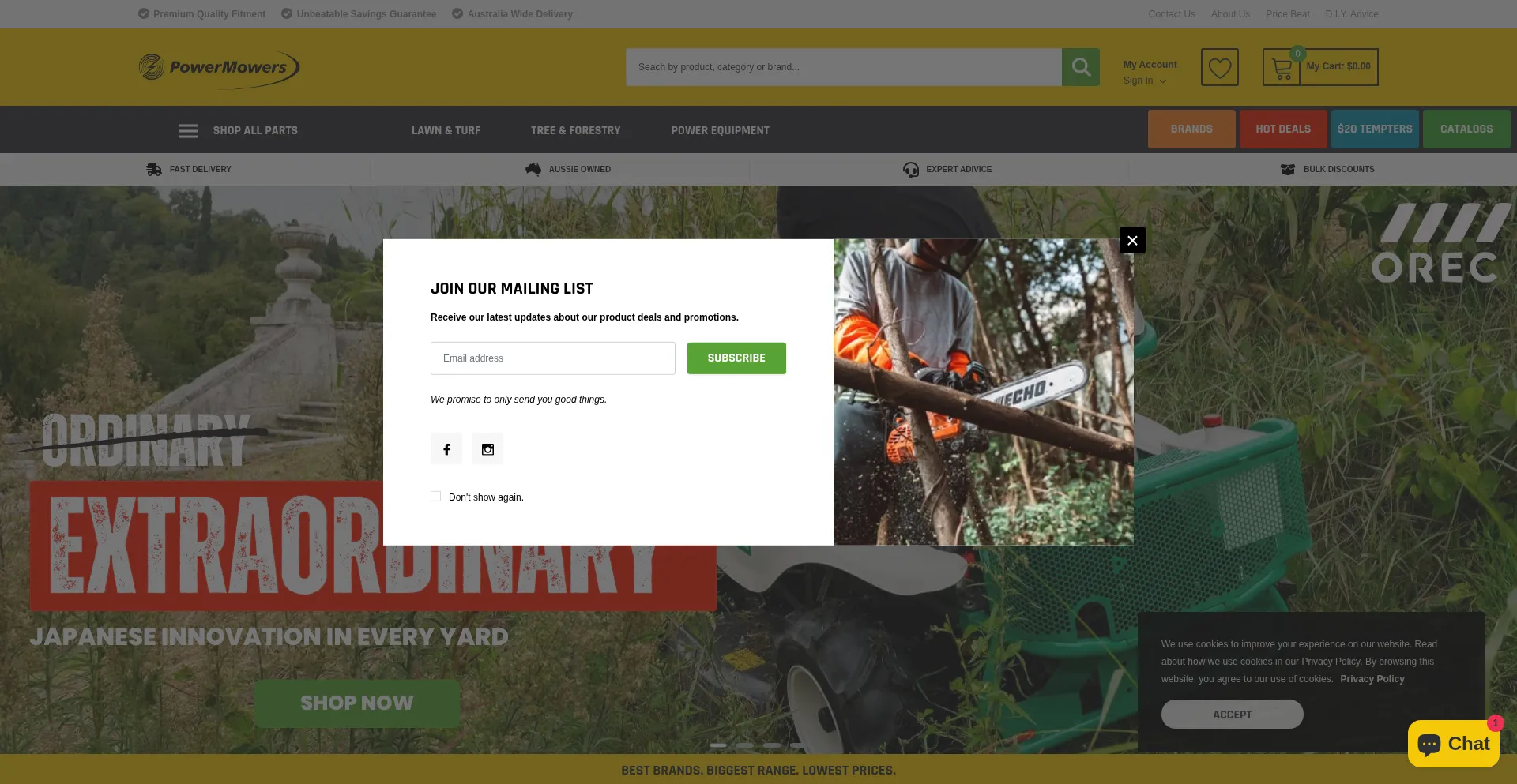 Die Website implementiert Cookie-Zustimmungsmechanismen in Compliance mit Datenschutzregulierungen wie DSGVO oder CCPA. Dies demonstriert, dass powermowers.com.au Datenschutzstandards einhält und Benutzern Kontrolle über persönliche Datenerfassungspraktiken bietet.