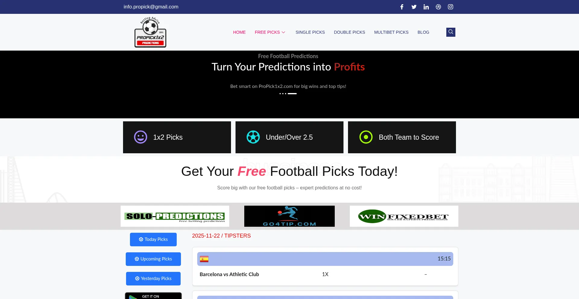 Free Football Predictions Turn Your Predictions into Profits Bet smart on ProPick1x2.com for big wins and top tips! 1x2 Picks Under/Over 2.5 Both Team to Score bussiness Get You...