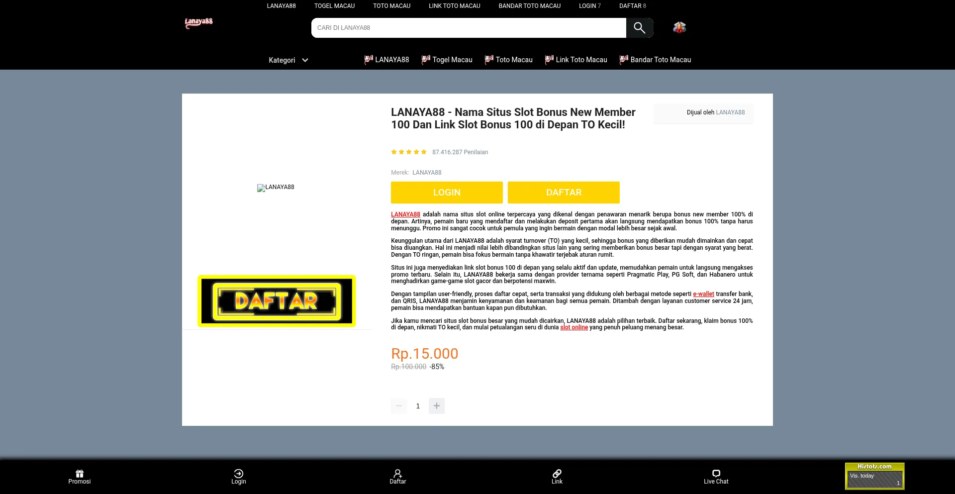 LANAYA88 adalah nama situs slot terpercaya yang menawarkan bonus new member 100% di depan dengan turnover (TO) kecil, sehingga mudah dicairkan dan cepat dimainkan. Melalui link...
