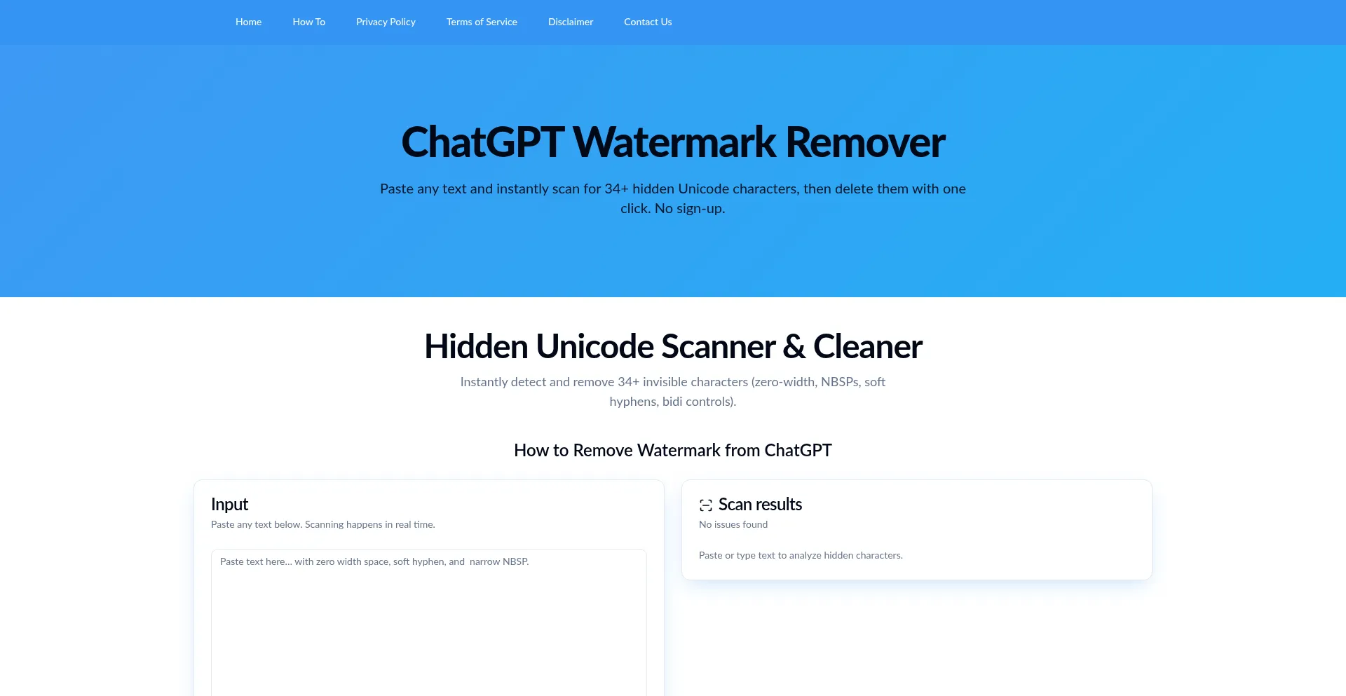 Remove ChatGPT watermarks by scanning and cleaning hidden Unicode characters (zero‑width, no‑break spaces, soft hyphens). Free and instant.