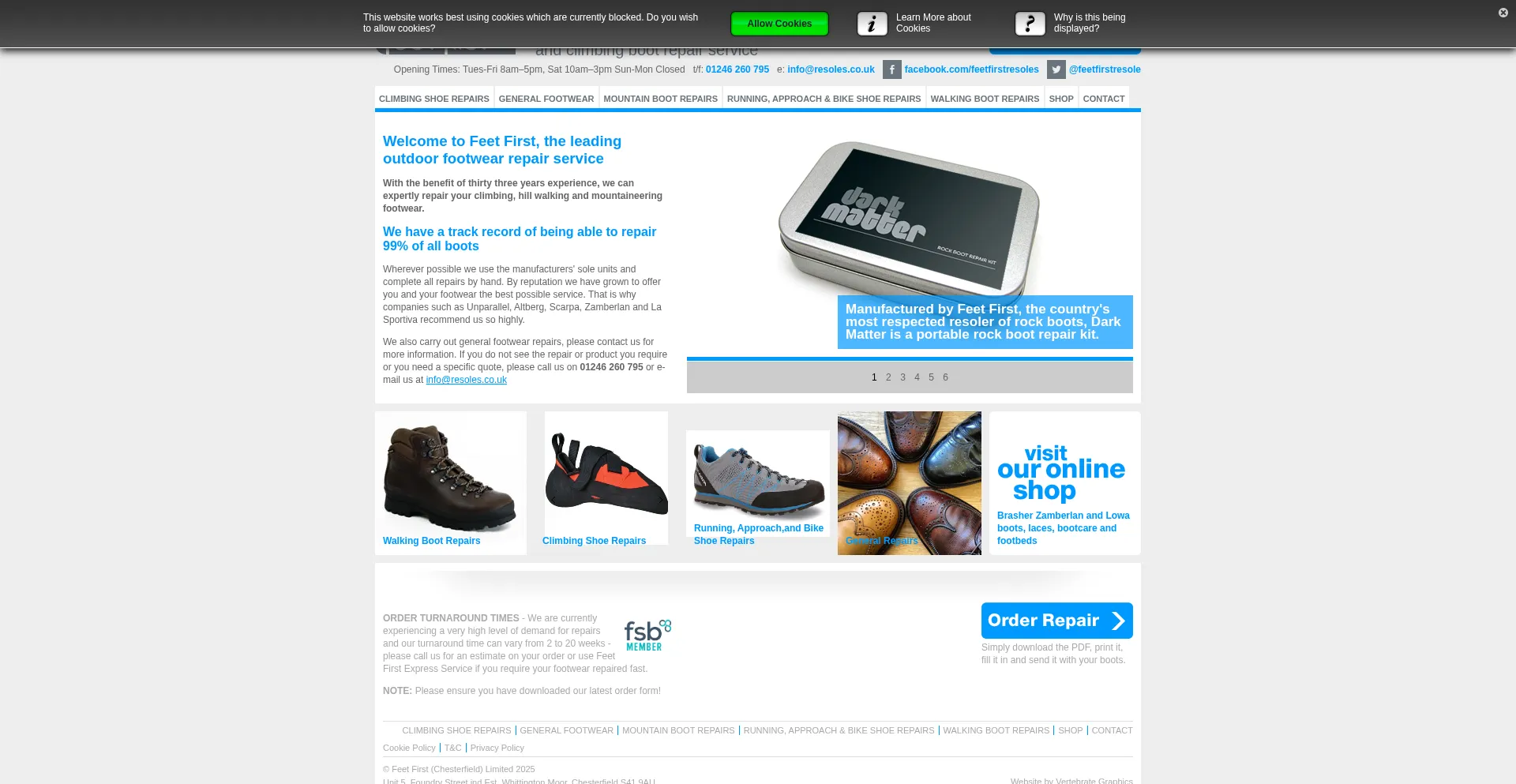 Feet First Resoles are based in Chesterfield, Derbyshire, Europe's leading outdoor shoe and boot repair service, carrying out repairs on walking boots, climbing shoes, mountaine...