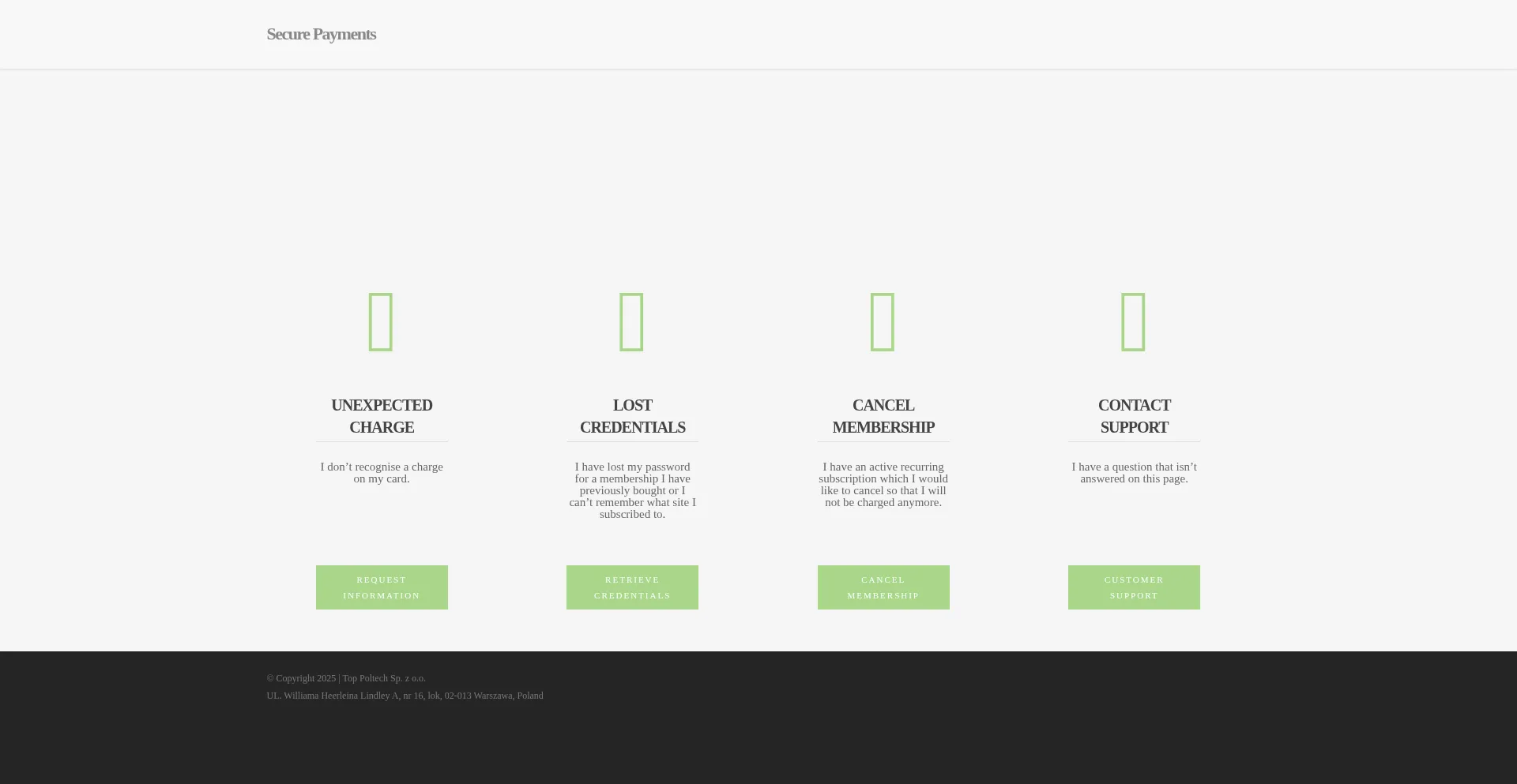 Die Website enthält dedizierte Bereiche zur Behandlung von Zahlungsstreitigkeiten, Abonnementverwaltung, Rückbuchungsverfahren, Rückerstattungsrichtlinien und anderen finanziellen Transaktionsanliegen, was etablierte Abrechnungsoperationen anzeigt.