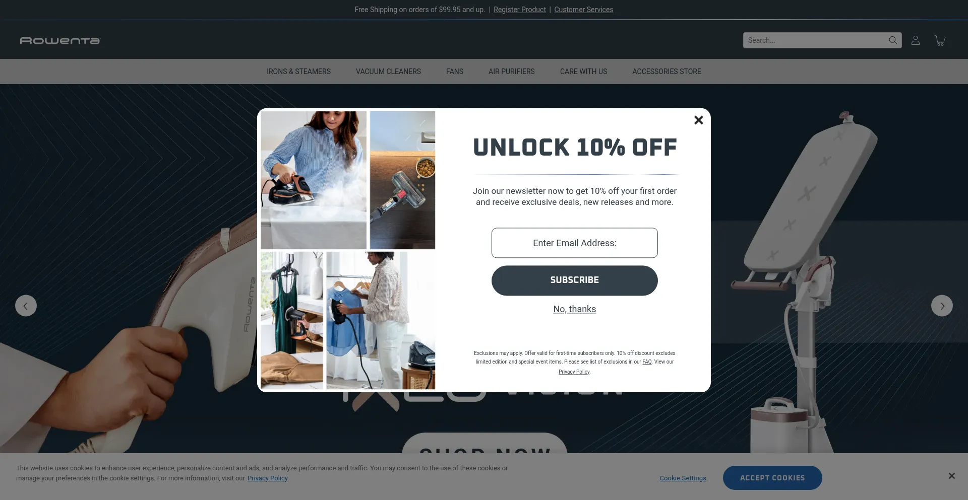 Die Website implementiert Cookie-Zustimmungsmechanismen in Compliance mit Datenschutzregulierungen wie DSGVO oder CCPA. Dies demonstriert, dass rowenta.com Datenschutzstandards einhält und Benutzern Kontrolle über persönliche Datenerfassungspraktiken bietet.