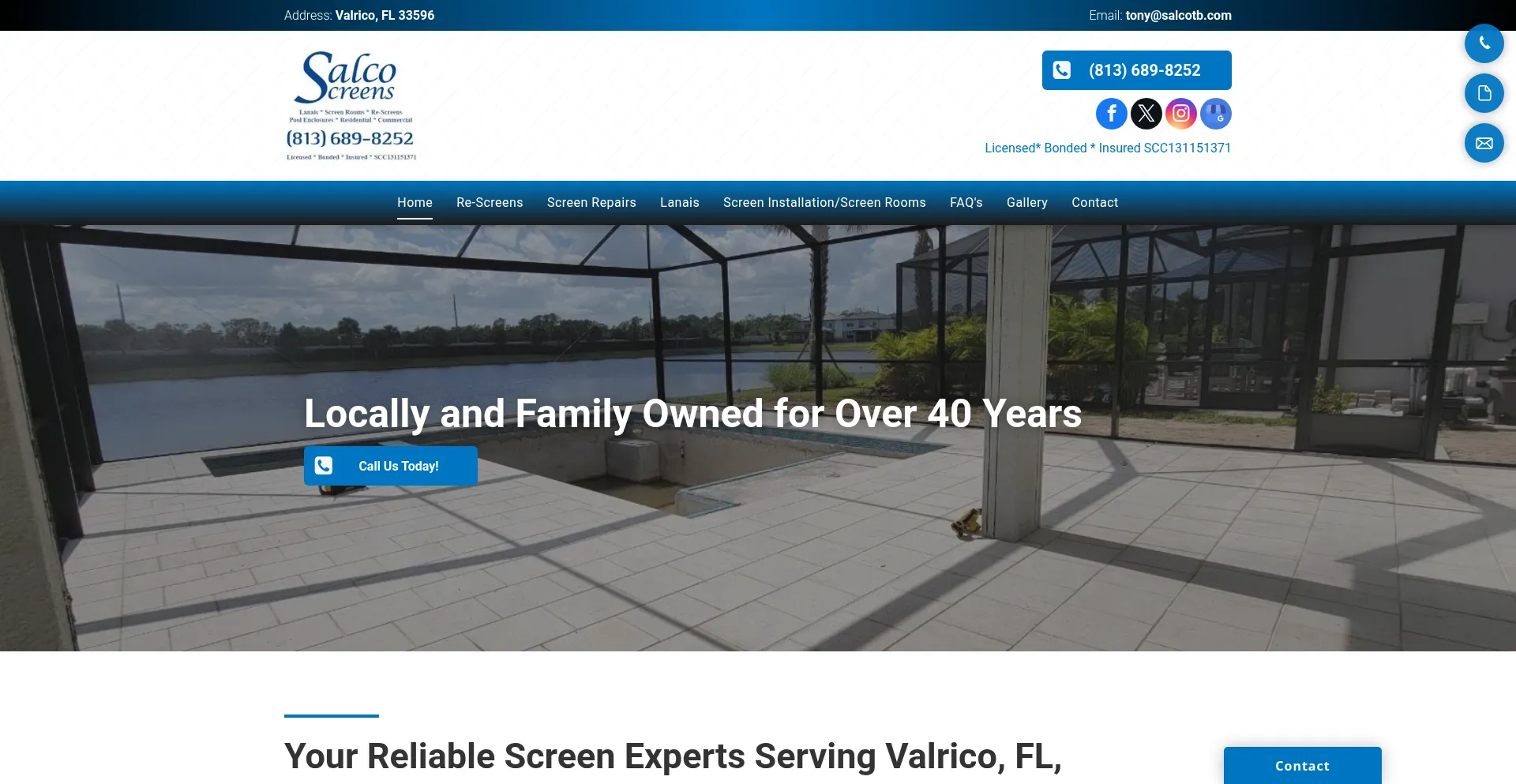 Salco Screens in Valrico, FL, has provided our community screen installations and repair services for 40 years. Call us today at (813) 689-8252.