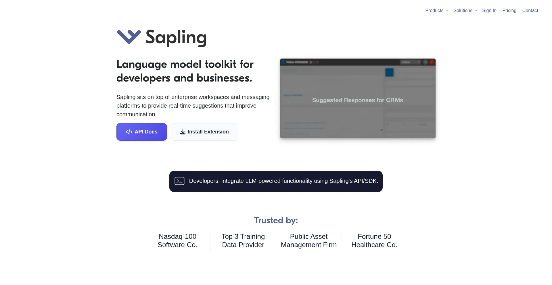 Sapling language model API toolkit and copilot for enterprise tasks. Sapling offers an API/SDK and turnkey integrations for grammar/spell checking, autocomplete, AI detection, p...
