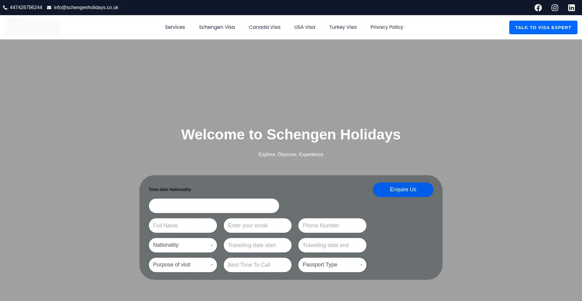 Die Website implementiert Datenerfassungsformulare, die persönliche Informationen einschließlich Namen, E-Mail-Adressen, Telefonnummern oder andere sensible Details anfordern. Benutzer sollten die Legitimität von schengenholidays.co.uk verifizieren und Datenschutzrichtlinien überprüfen, bevor sie persönliche Daten übermitteln.