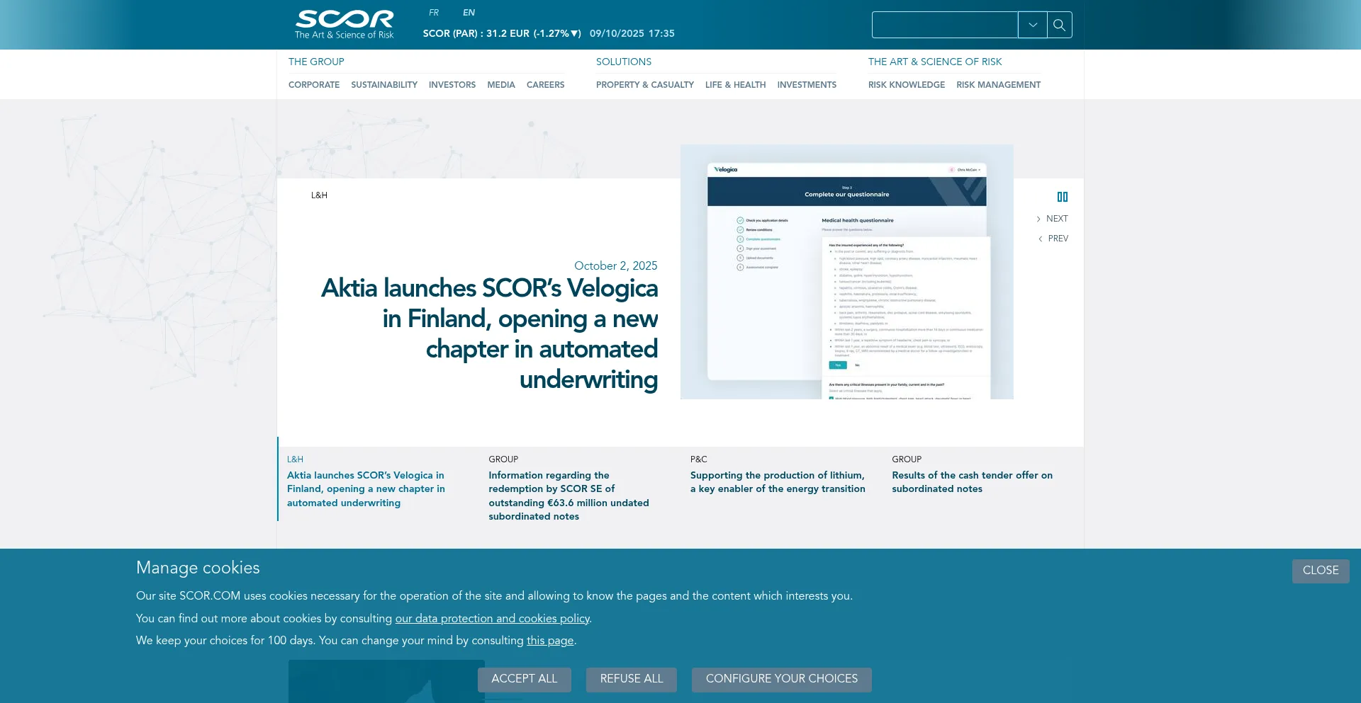 Die Website implementiert Cookie-Zustimmungsmechanismen in Compliance mit Datenschutzregulierungen wie DSGVO oder CCPA. Dies demonstriert, dass scor.com Datenschutzstandards einhält und Benutzern Kontrolle über persönliche Datenerfassungspraktiken bietet.