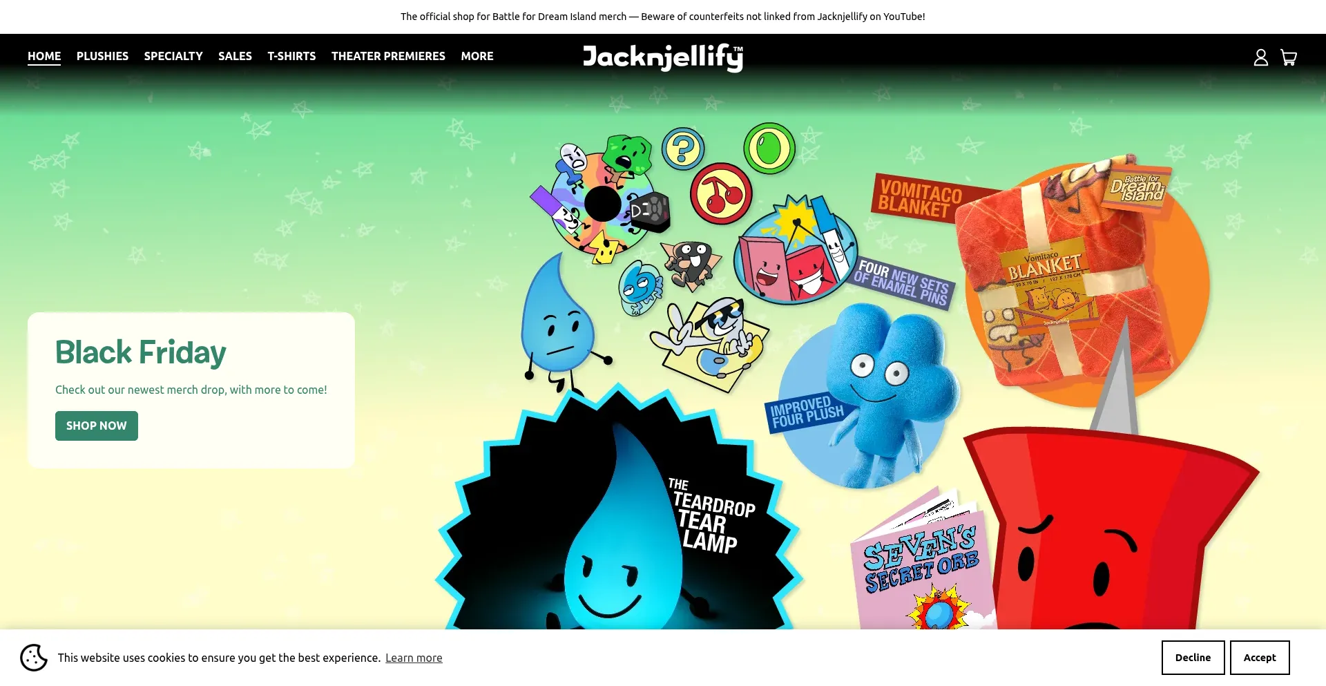 The official Jacknjellify store, featuring plushies and merchandise from the show Battle for Dream Island (BFDI)!