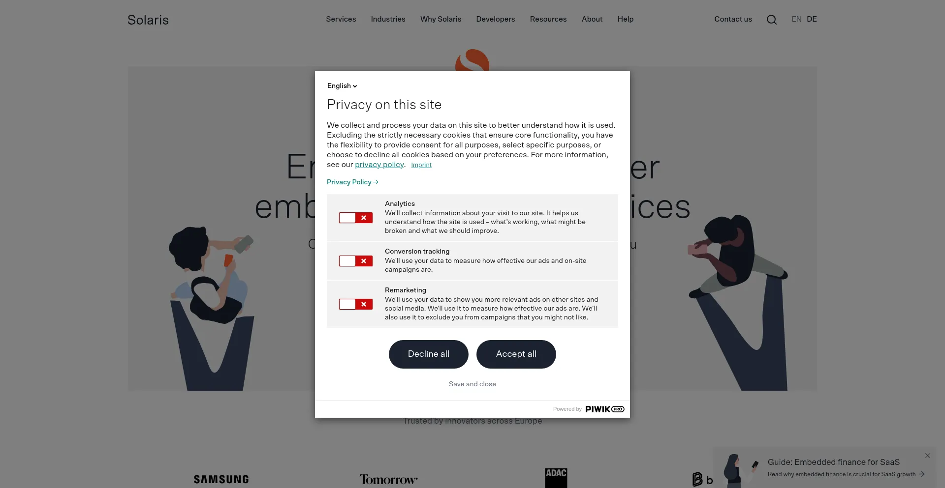 Solaris is Europe's largest embedded finance platform → Seamlessly integrate digital banking and payment services directly into your product offering via API.