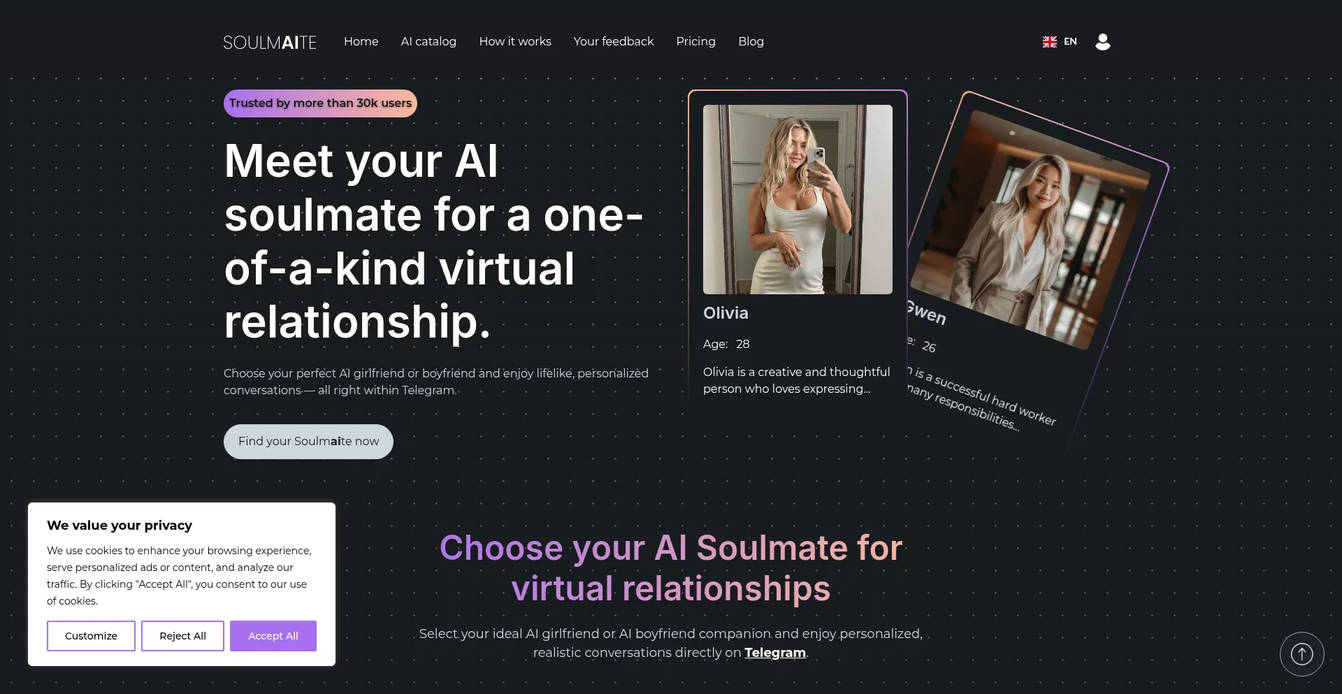 Soulmaite is the world's first platform for realistic AI girlfriend & boyfriend relationships with virtual AI companions via Telegram. Try this AI soulmate generator now!