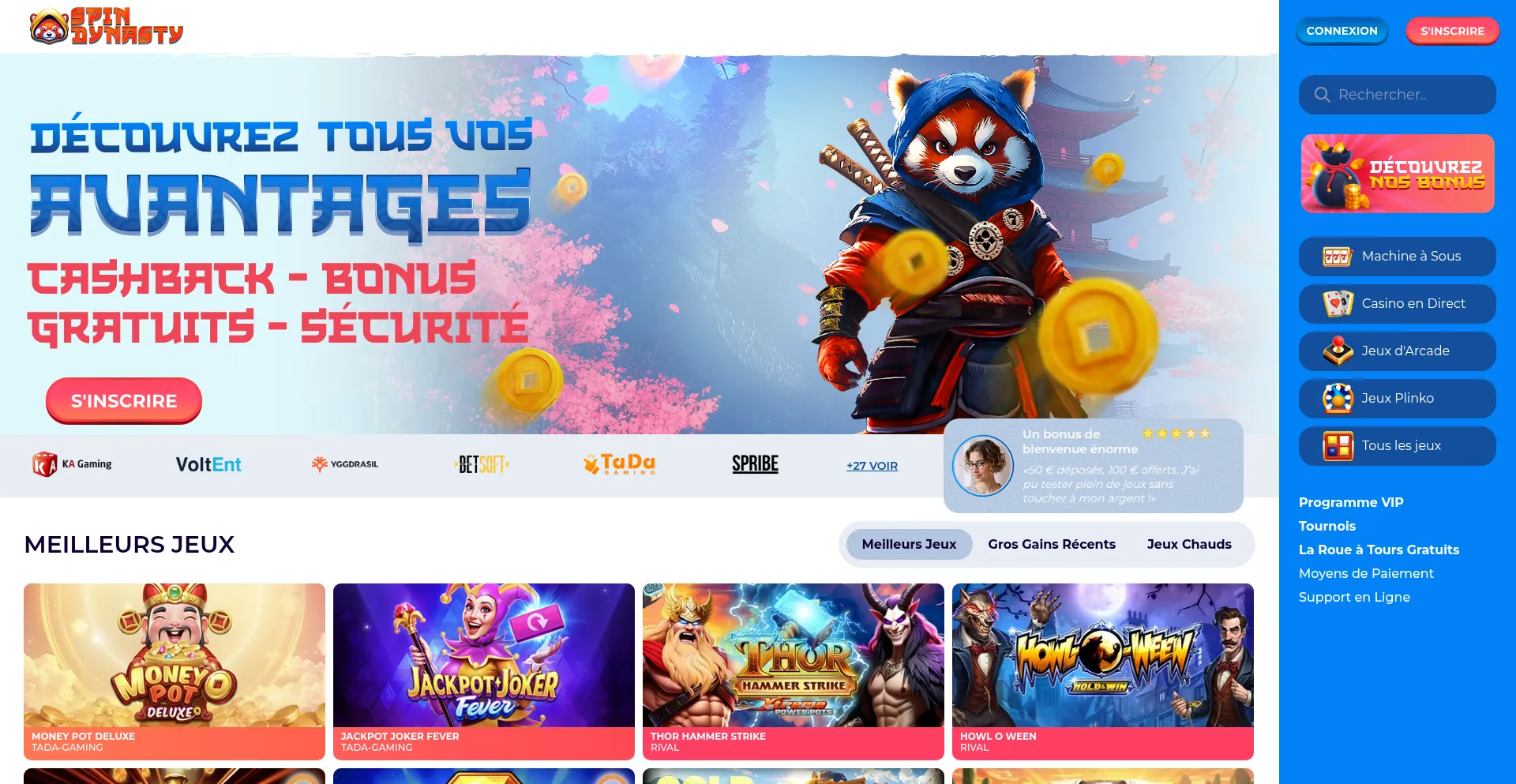 Jouez sans wager sur Spin Dynasty, le casino en ligne qui enchante les joueurs français. Machines à sous, jeux en direct, bonus et Tours Gratuits vous attendent !