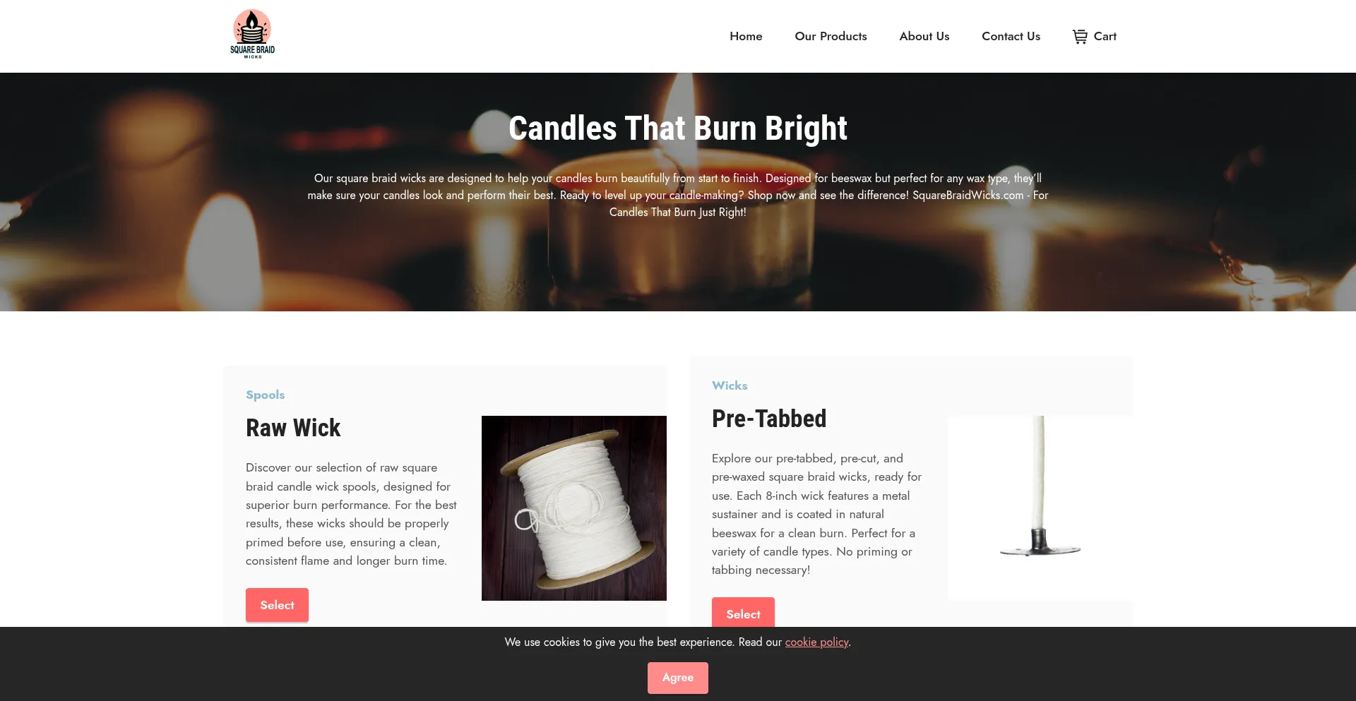 Explore our selection of square braid candle wick spools, including raw wicks and pre-tabbed, pre-cut, and pre-waxed wicks for a clean, consistent burn. Perfect for all candle t...