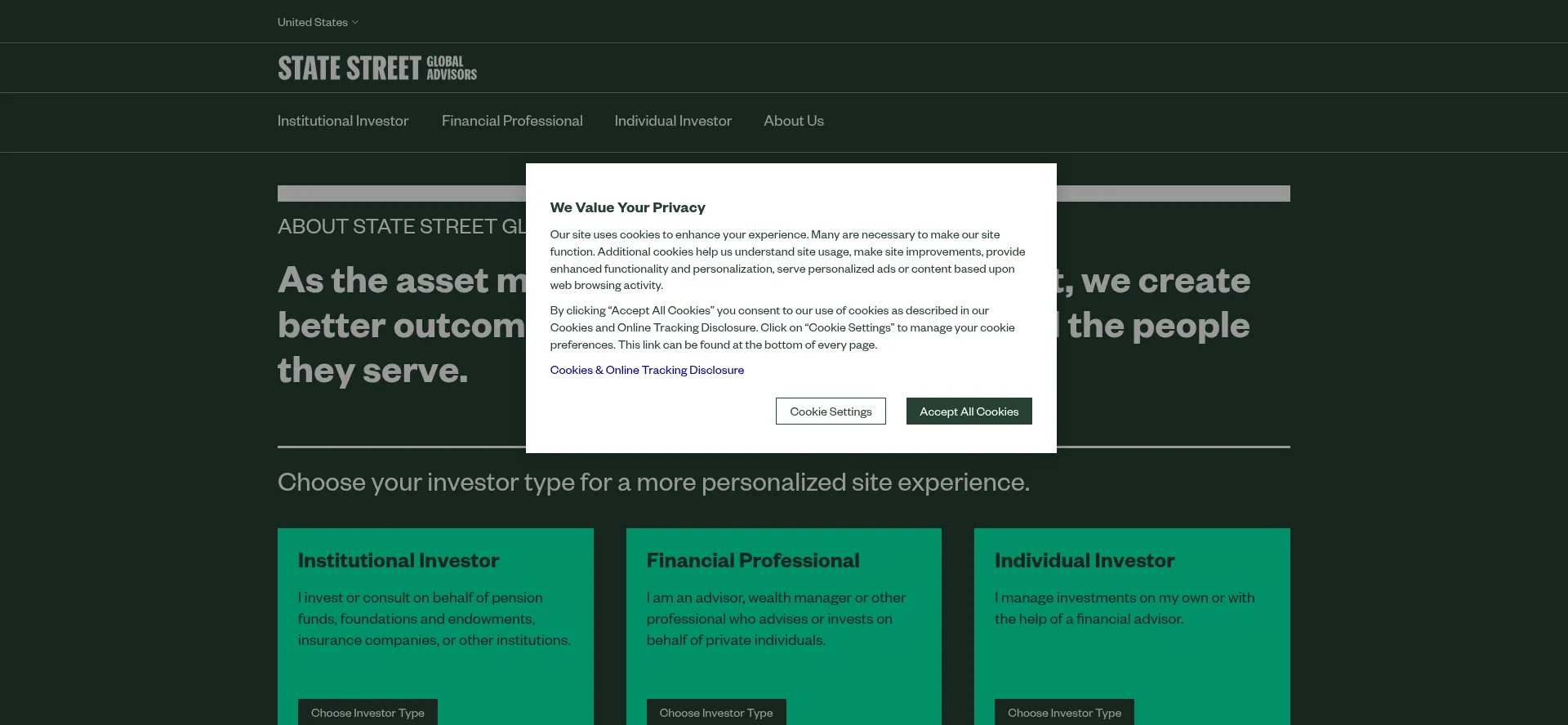 Die Website implementiert Cookie-Zustimmungsmechanismen in Compliance mit Datenschutzregulierungen wie DSGVO oder CCPA. Dies demonstriert, dass ssga.com Datenschutzstandards einhält und Benutzern Kontrolle über persönliche Datenerfassungspraktiken bietet.