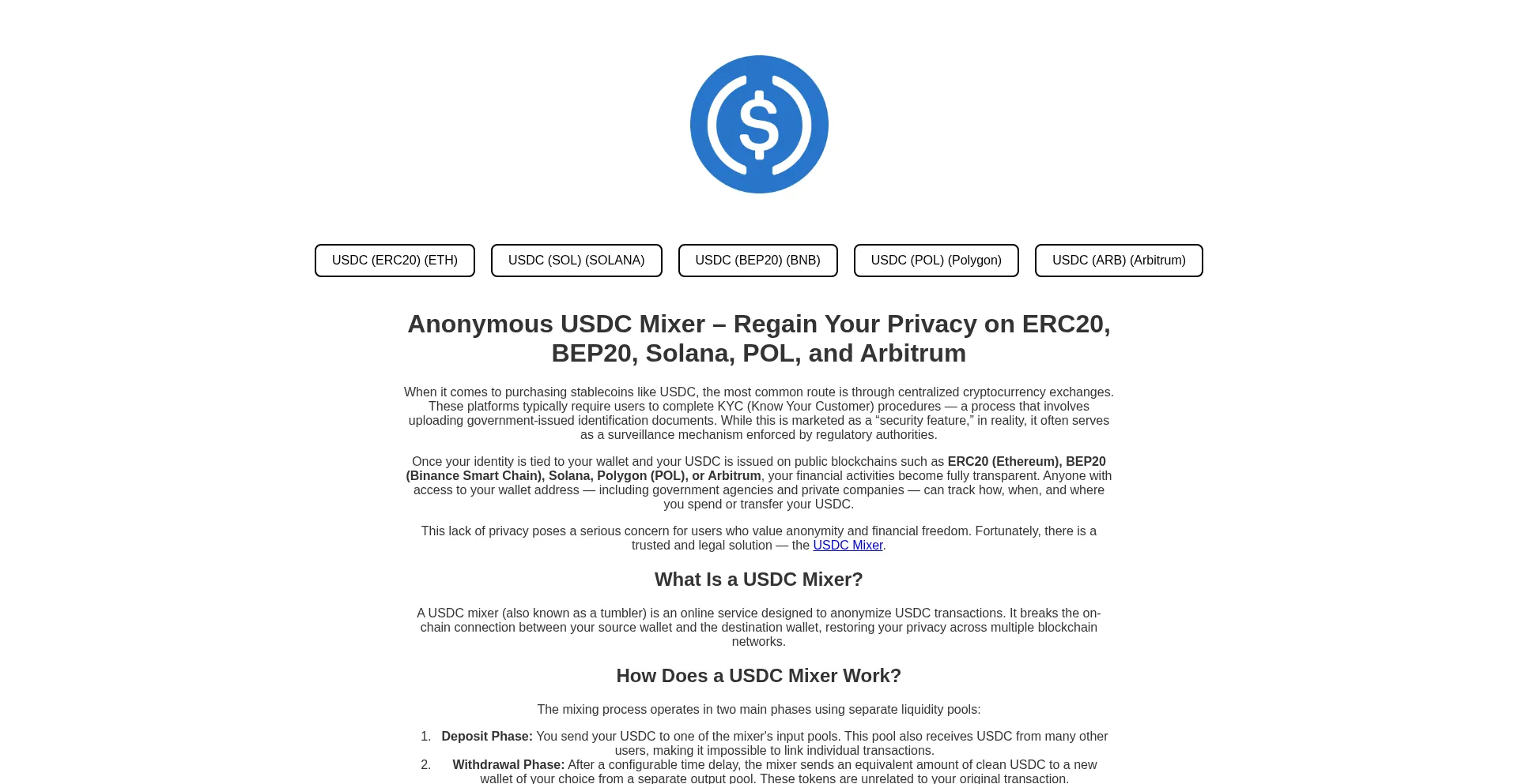 USDC Mixer – Anonymous USDC Tumbler for ERC20, BEP20, Solana, POL & Arbitrum