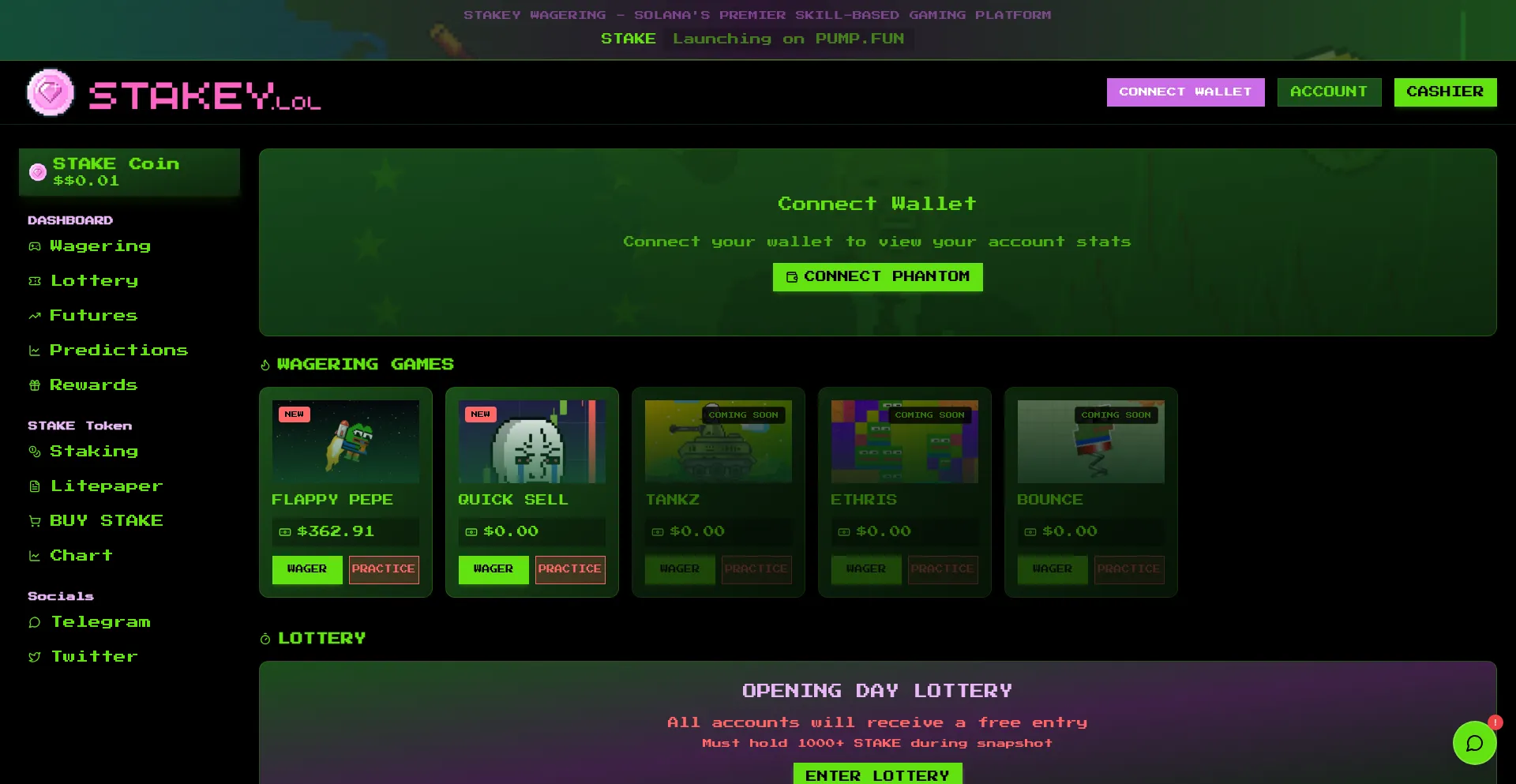 Play skill-based games and wager with STAKEY token on Solana. Features Flappy Pepe, Quick Sell crash game, and more wagering games.
