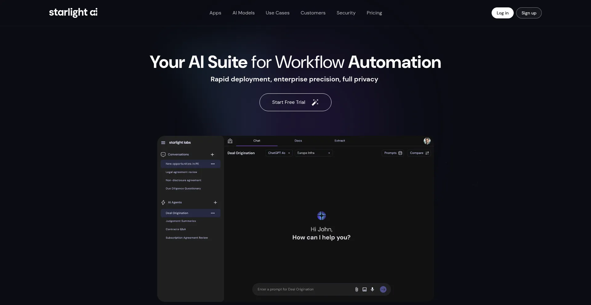 Increase productivity with Starlight AI's custom AI agents. Automate workflows, extract data, and generate documents with AI. Start your free trial today