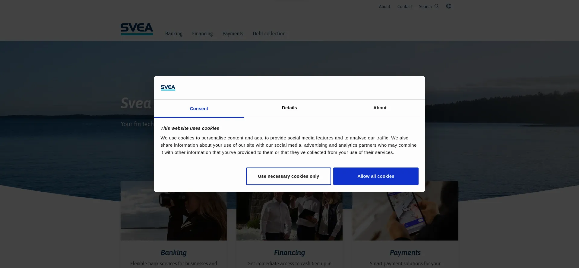 Die Website implementiert Cookie-Zustimmungsmechanismen in Compliance mit Datenschutzregulierungen wie DSGVO oder CCPA. Dies demonstriert, dass svea.com Datenschutzstandards einhält und Benutzern Kontrolle über persönliche Datenerfassungspraktiken bietet.