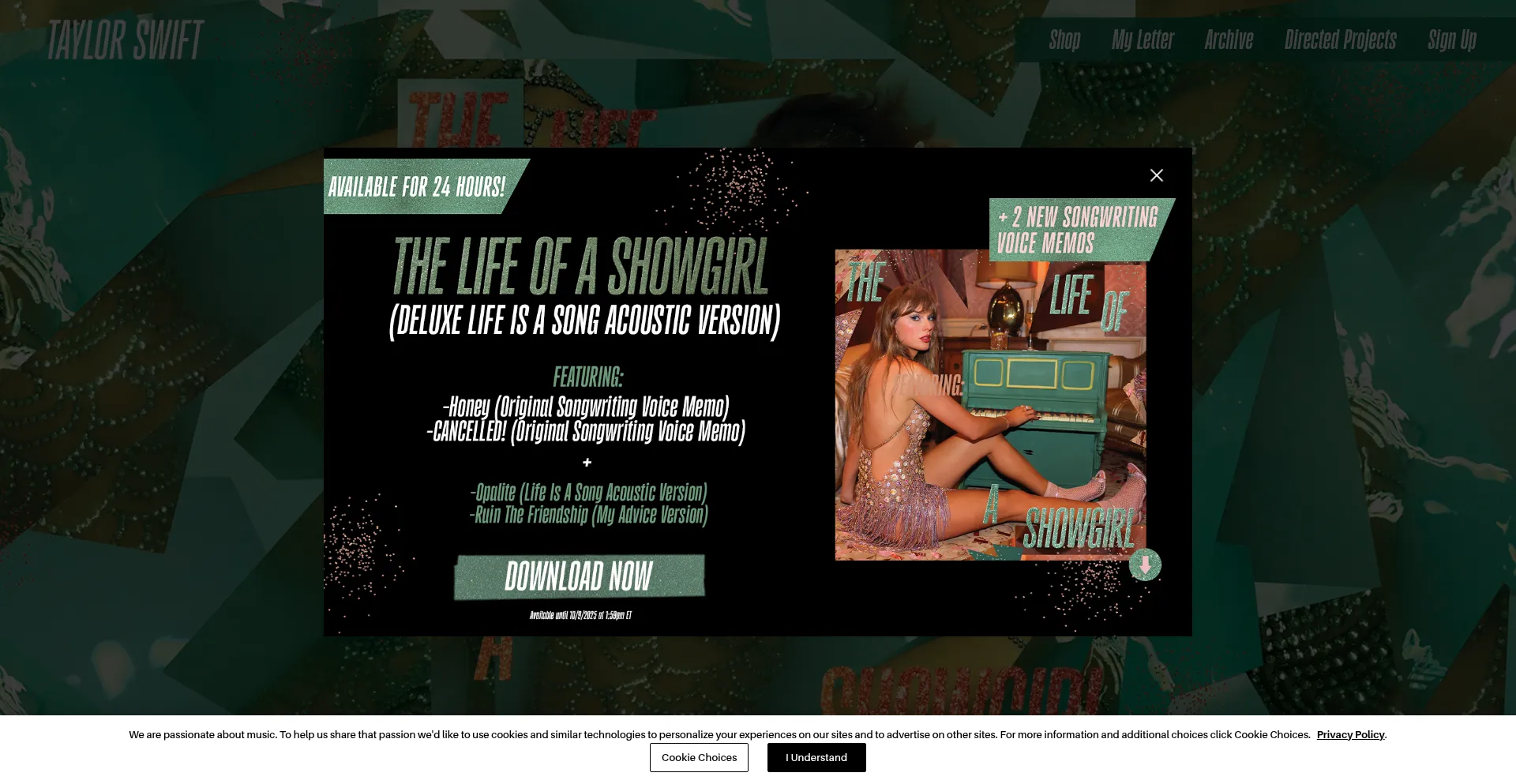 Die Website implementiert Cookie-Zustimmungsmechanismen in Compliance mit Datenschutzregulierungen wie DSGVO oder CCPA. Dies demonstriert, dass taylorswift.com Datenschutzstandards einhält und Benutzern Kontrolle über persönliche Datenerfassungspraktiken bietet.