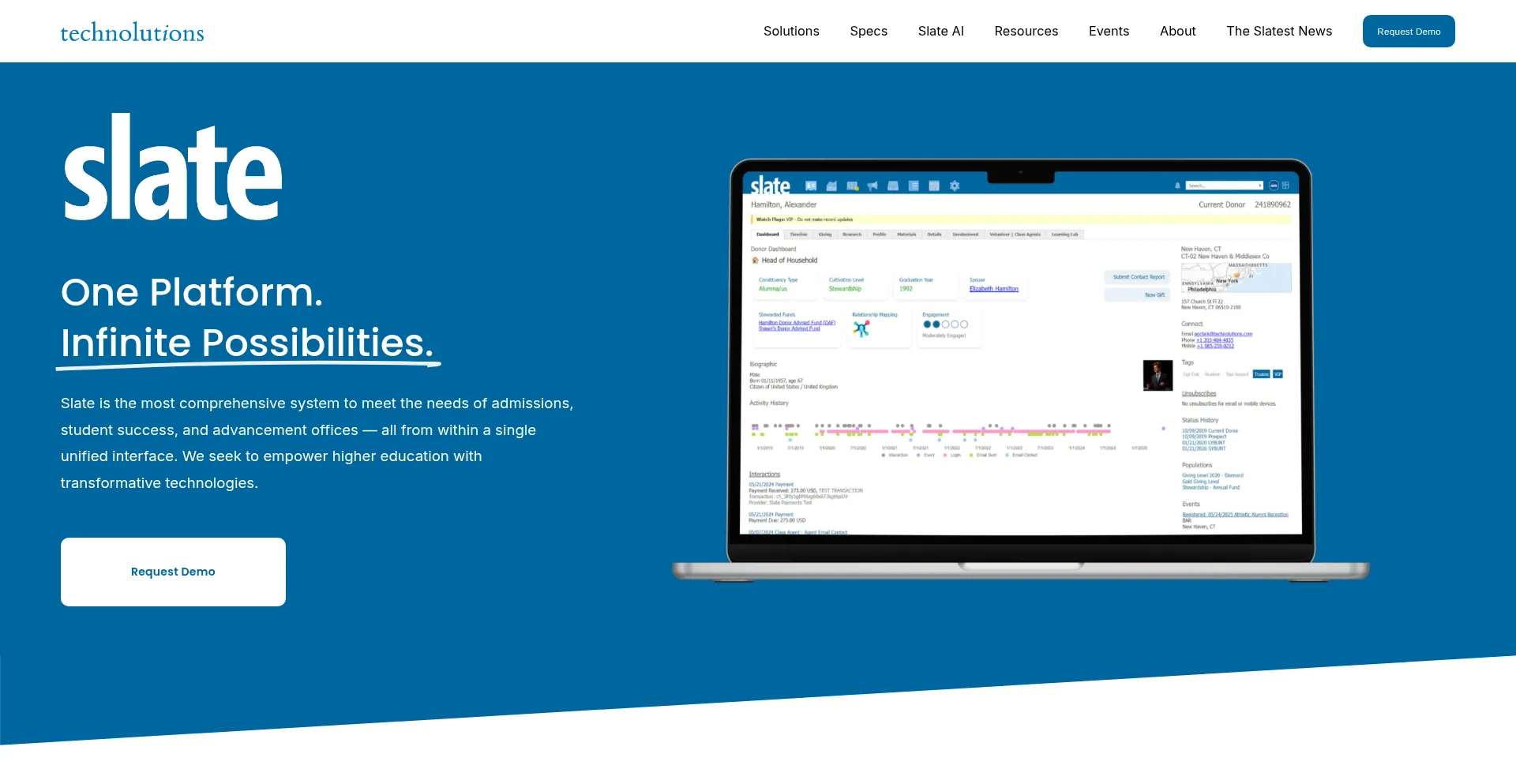 Slate is the most comprehensive system to meet the needs of admissions, student success, and advancement offices — all from within a single unified interface.