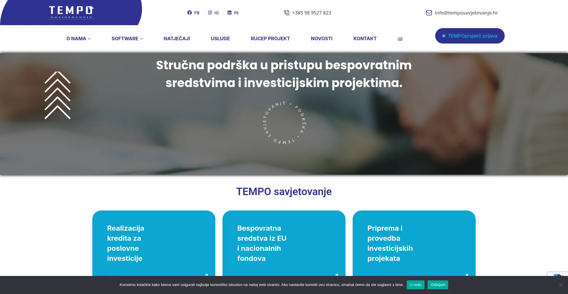 Die Anwesenheit von Social-Media-Links auf der Website deutet darauf hin, dass temposavjetovanje.hr offizielle Konten auf Social-Media-Plattformen beibehält, was ein positiver Indikator für Glaubwürdigkeit und Engagement ist.