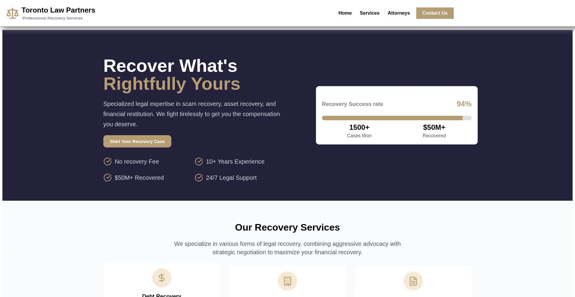 Die Website torontolawpartners.ca bewirbt Fondswiederherstellungsdienste für verlorene oder gestohlene Vermögenswerte. Während einige auf Erfolgshonorarbasis operieren, können andere Vorauszahlungen erfordern, was auf betrügerische Operationen hinweisen kann. Verifizieren Sie Anmeldeinformationen und regulatorische Compliance, bevor Sie solche Dienste in Anspruch nehmen.