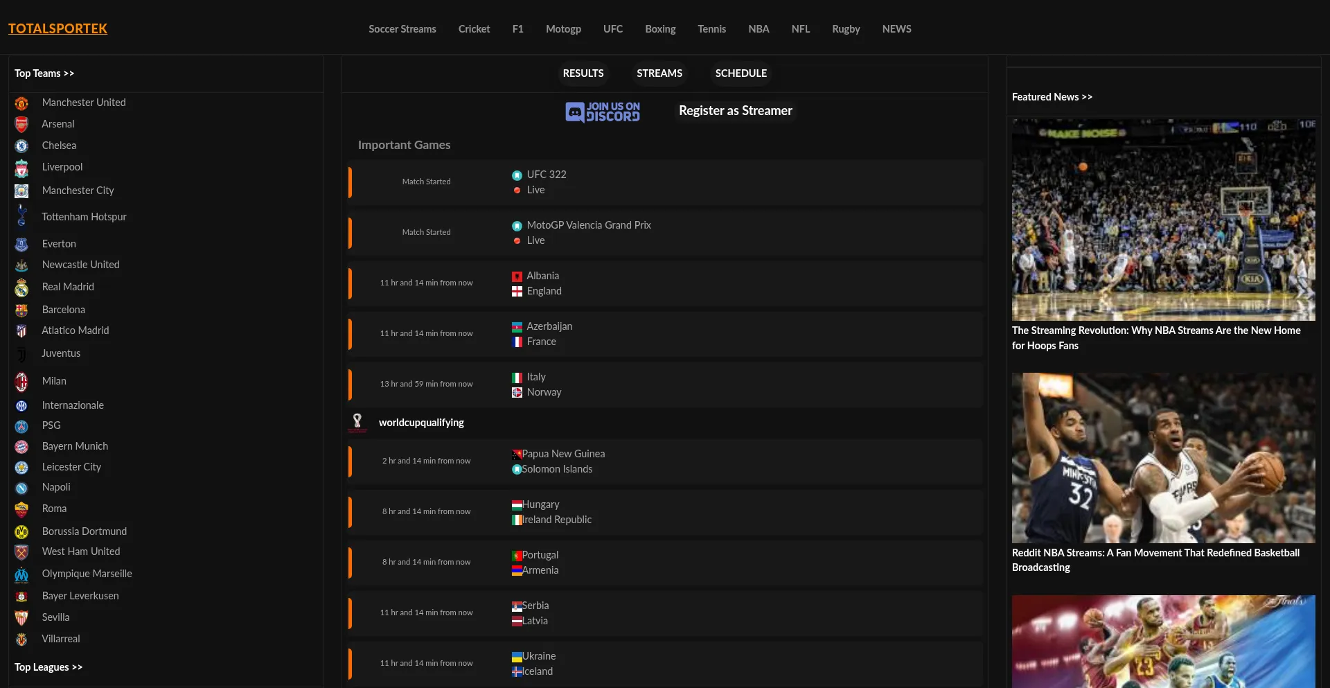 TOTALSPORTEK New, fast and mobile friendly layout bringing you best live streaming of sports 75+ working links for every match.