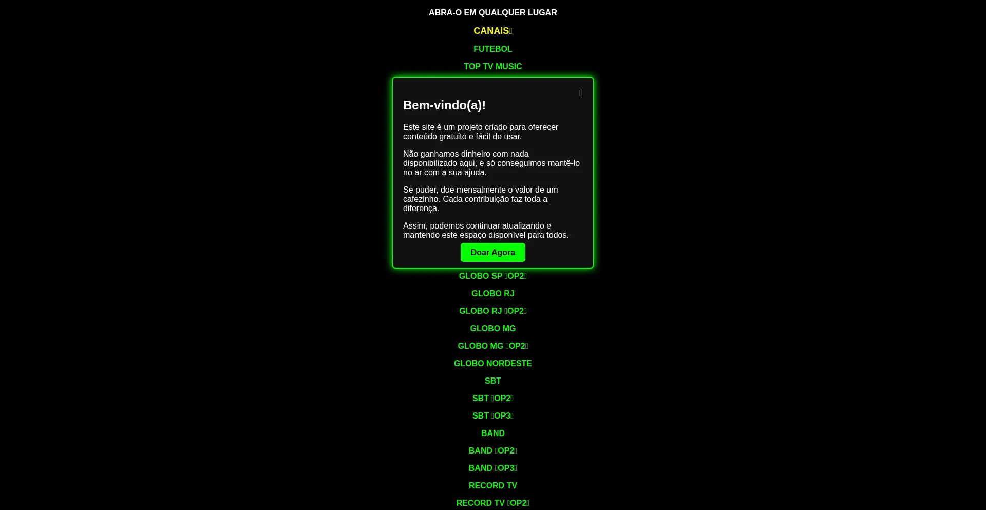 Venha assistir TV a Cabo online e Futebol ao vivo Grátis em HD. Canais como: Globo, SBT, Record, HBO, SporTV, Premiere e muito mais! Sem anúncios e sem travar