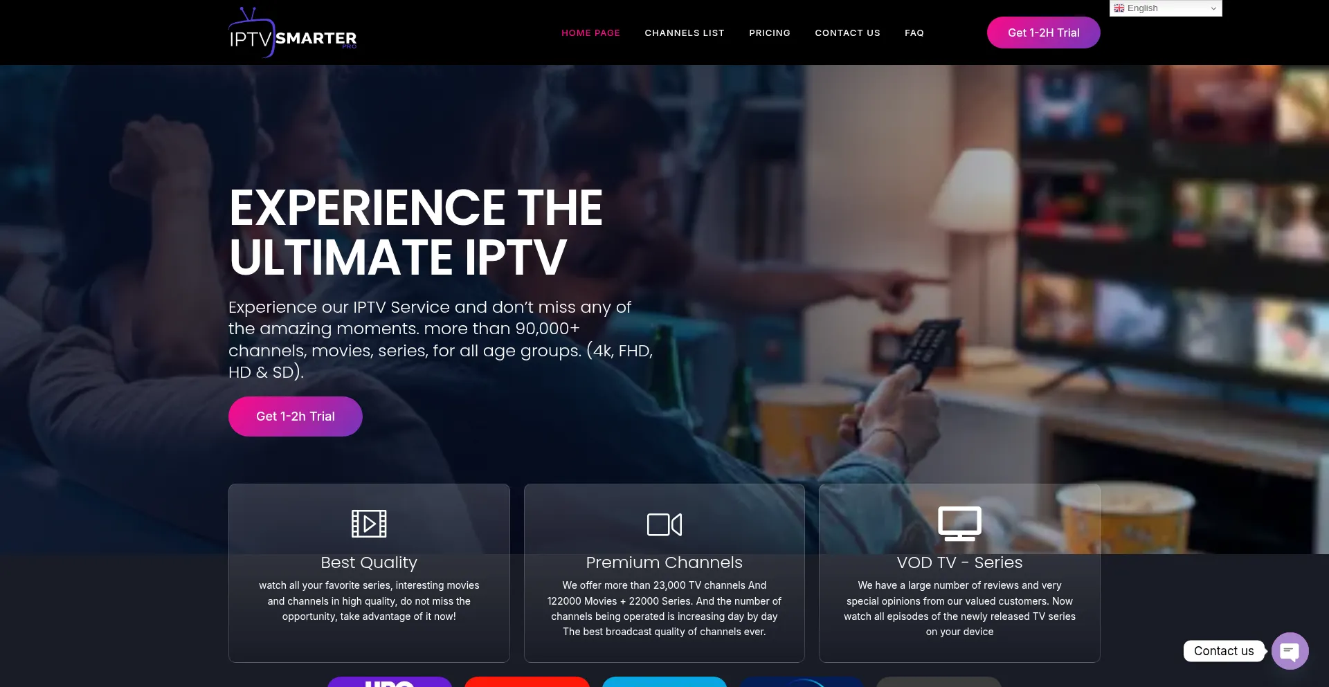 Get 1-2H Trial EXPERIENCE THE ULTIMATE IPTV Experience our IPTV Service and don’t miss any of the amazing moments. more than 90,000+ channels, movies, series, for all age grou...