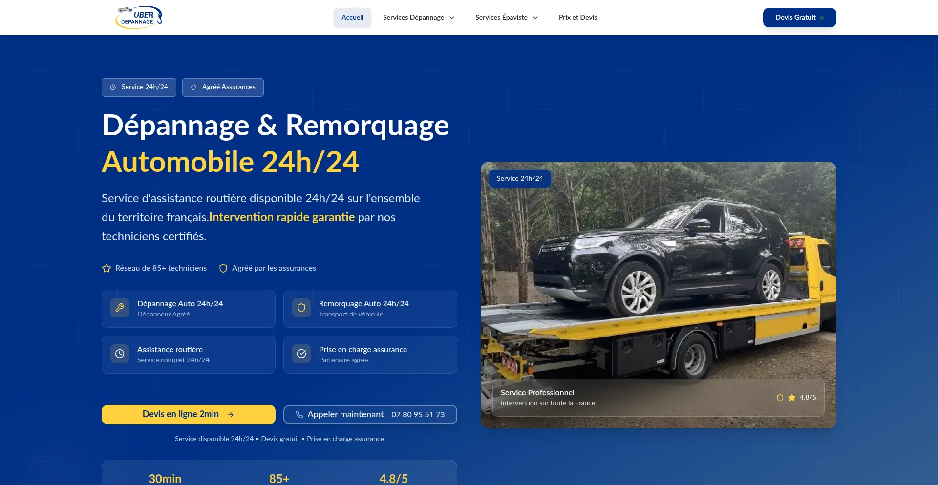 Service de dépannage auto et remorquage disponible 24h/24 et 7j/7 partout en France. Intervention rapide, tarifs transparents, assistance routière pour votre voiture en panne.