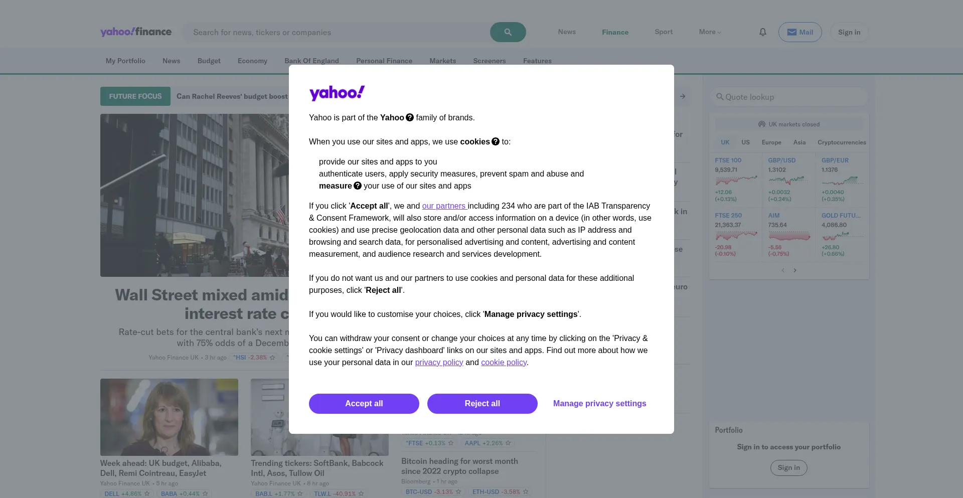 Die Website implementiert Cookie-Zustimmungsmechanismen in Compliance mit Datenschutzregulierungen wie DSGVO oder CCPA. Dies demonstriert, dass uk.finance.yahoo.com Datenschutzstandards einhält und Benutzern Kontrolle über persönliche Datenerfassungspraktiken bietet.