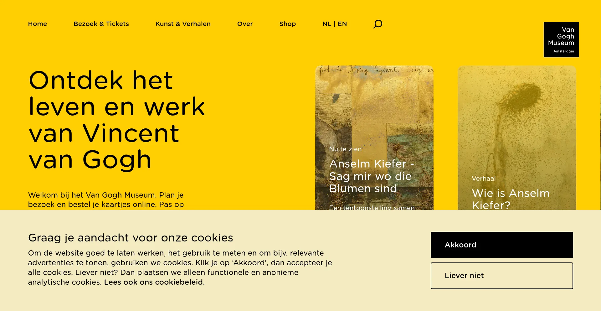 Die Website implementiert Cookie-Zustimmungsmechanismen in Compliance mit Datenschutzregulierungen wie DSGVO oder CCPA. Dies demonstriert, dass vangoghmuseum.nl Datenschutzstandards einhält und Benutzern Kontrolle über persönliche Datenerfassungspraktiken bietet.