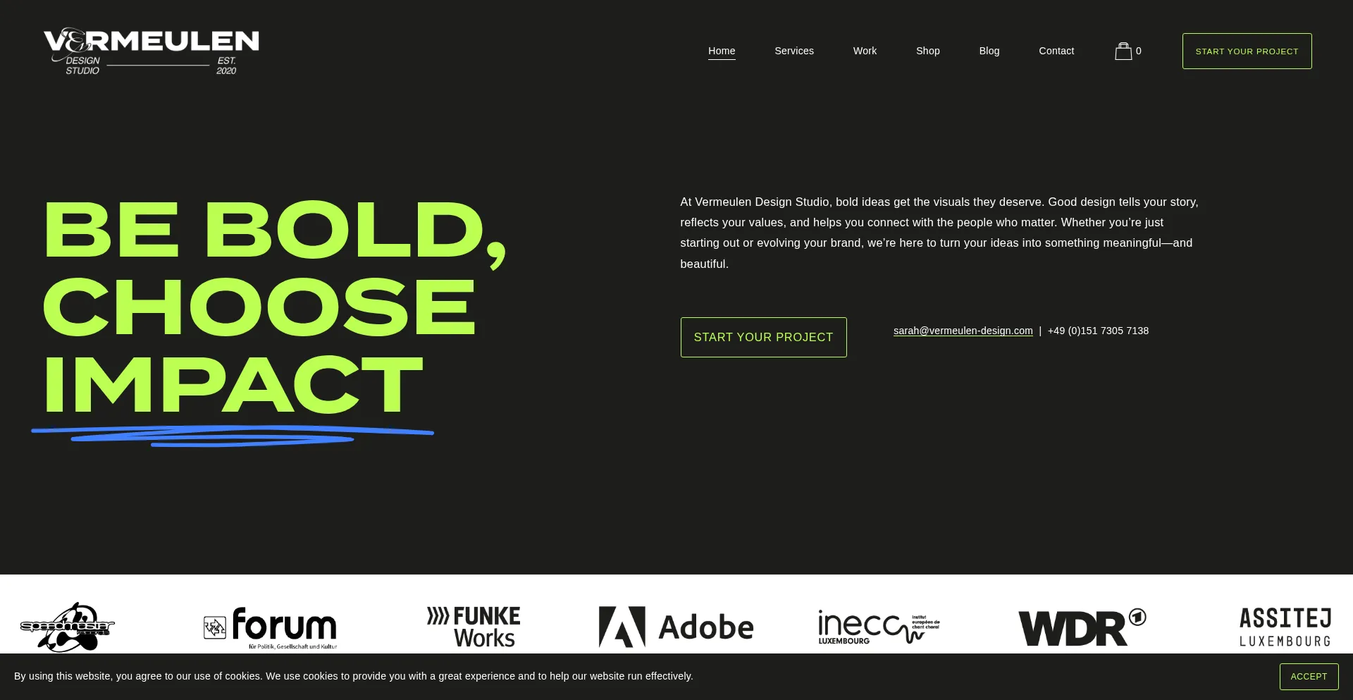 Vermeulen Design Studio creates impactful designs by understanding brand goals, conducting research, and crafting visuals like logos, websites, and print materials.