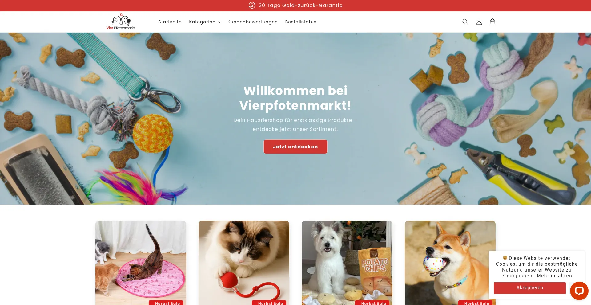 Entdecke hochwertige Produkte für deine Haustiere bei Vier Pfotenmarkt. Verwöhne deine Vierbeiner mit praktischem Zubehör, Spielzeug und Pflegeprodukten. Jetzt online shoppen...