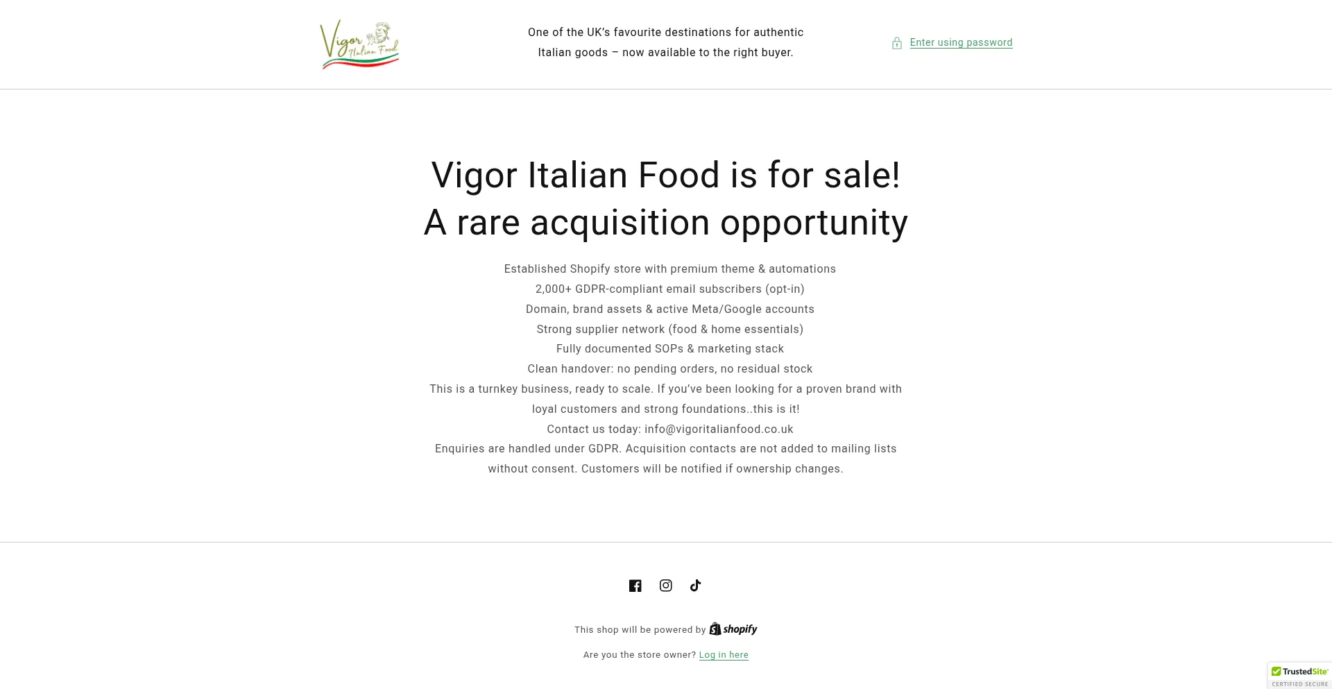 Die Anwesenheit von Social-Media-Links auf der Website deutet darauf hin, dass vigoritalianfood.co.uk offizielle Konten auf Social-Media-Plattformen beibehält, was ein positiver Indikator für Glaubwürdigkeit und Engagement ist.