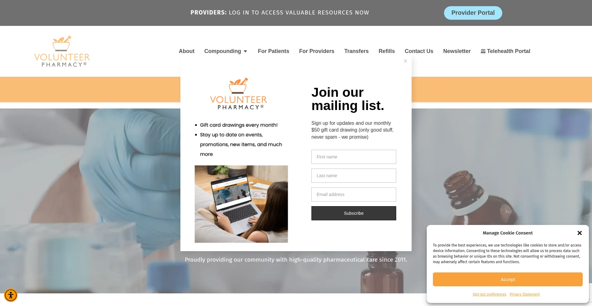 Die Website implementiert Cookie-Zustimmungsmechanismen in Compliance mit Datenschutzregulierungen wie DSGVO oder CCPA. Dies demonstriert, dass volunteerpharmacy.com Datenschutzstandards einhält und Benutzern Kontrolle über persönliche Datenerfassungspraktiken bietet.