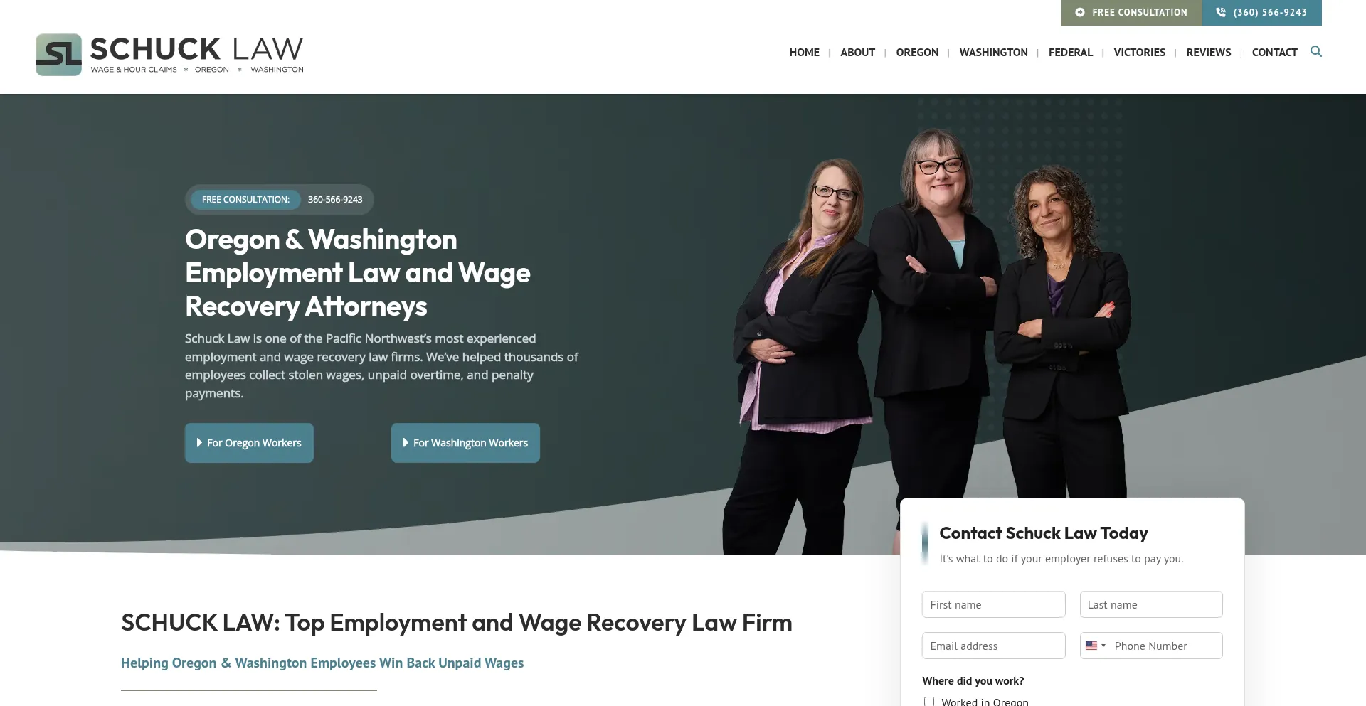 Schuck Law helps Oregon & Washington employees recover unpaid wages, overtime, and penalties. Over 60 years’ experience. Free consultation > call today.
