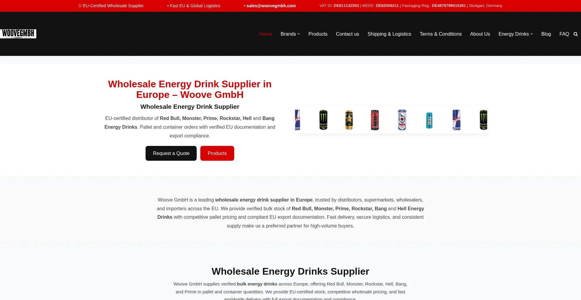 Woove GmbH, a leading EU-certified wholesale energy drink supplier from Germany, ships Red Bull, Monster, Prime, Rockstar, Hell & Bang in bulk across Europe.