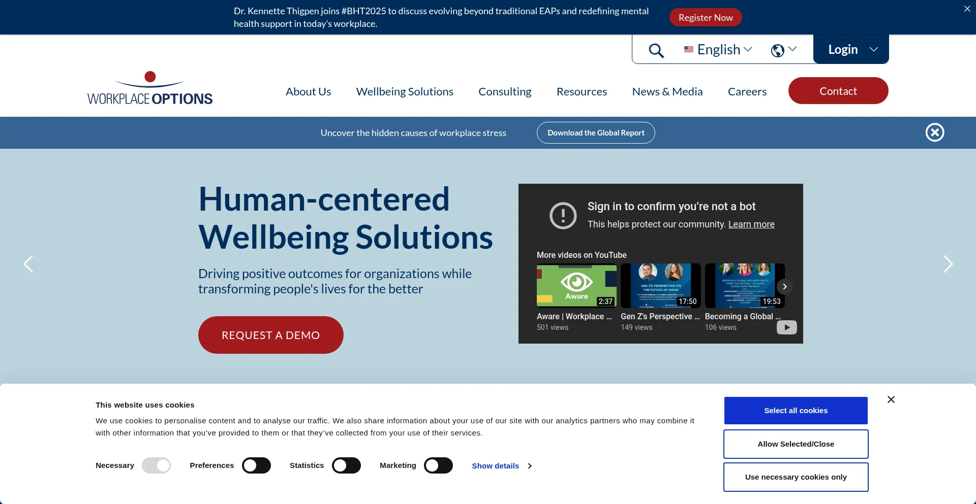Die Website implementiert Cookie-Zustimmungsmechanismen in Compliance mit Datenschutzregulierungen wie DSGVO oder CCPA. Dies demonstriert, dass workplaceoptions.com Datenschutzstandards einhält und Benutzern Kontrolle über persönliche Datenerfassungspraktiken bietet.