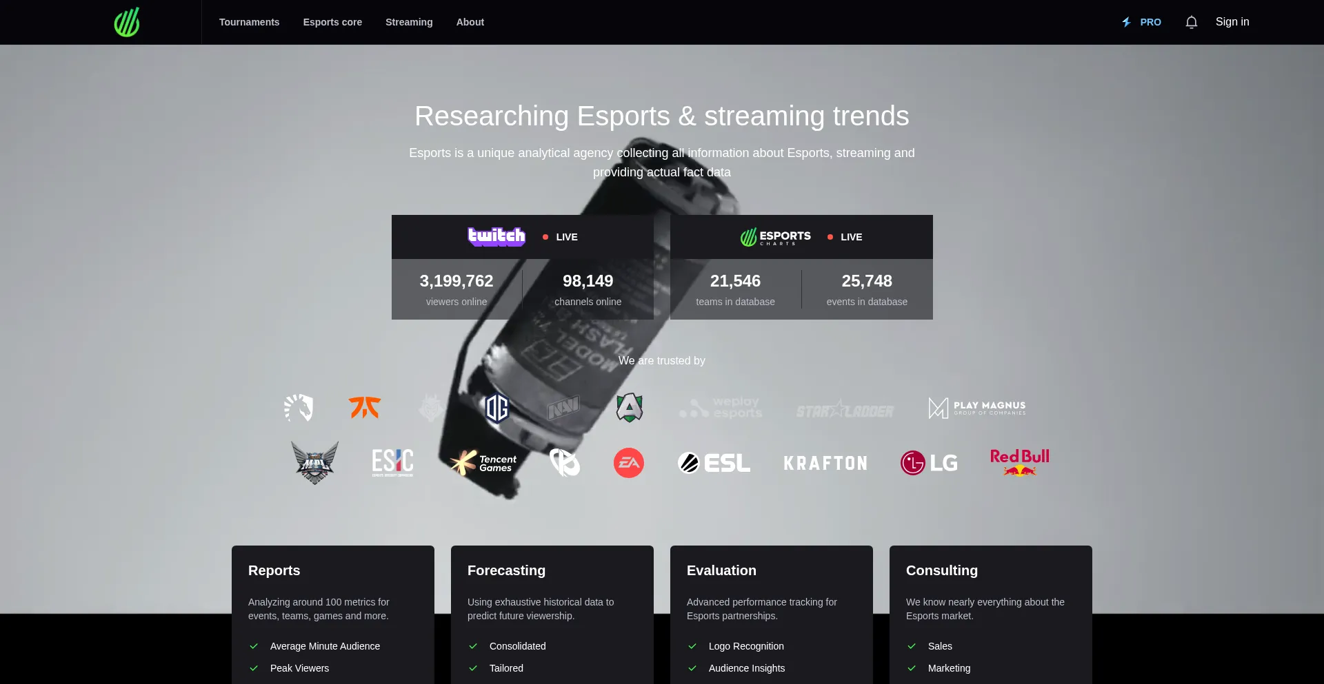 Esports is a unique analytical service that investigates trends of Esports development and streaming in general. Our service makes Esports more honest and clear, helps sponsors,...