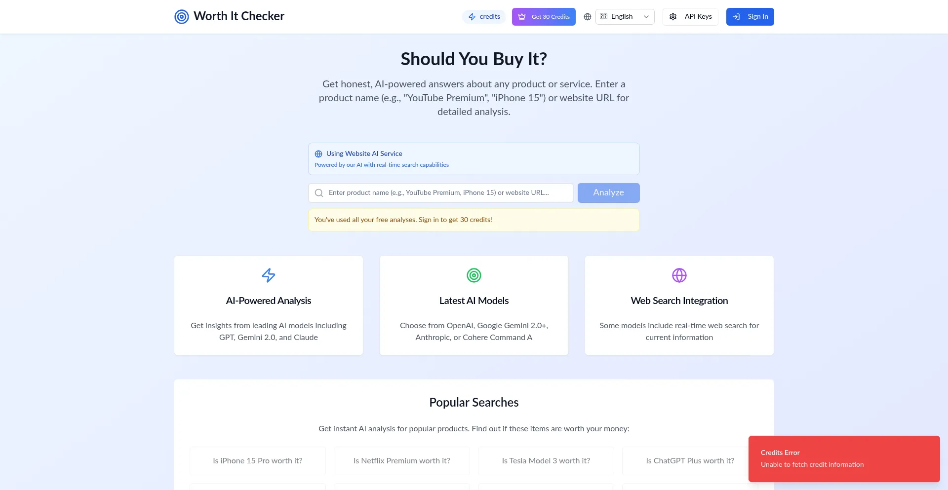 Get instant AI-powered analysis to determine if any product is worth buying. Compare pros, cons, alternatives, and get expert verdict with real-time web search.