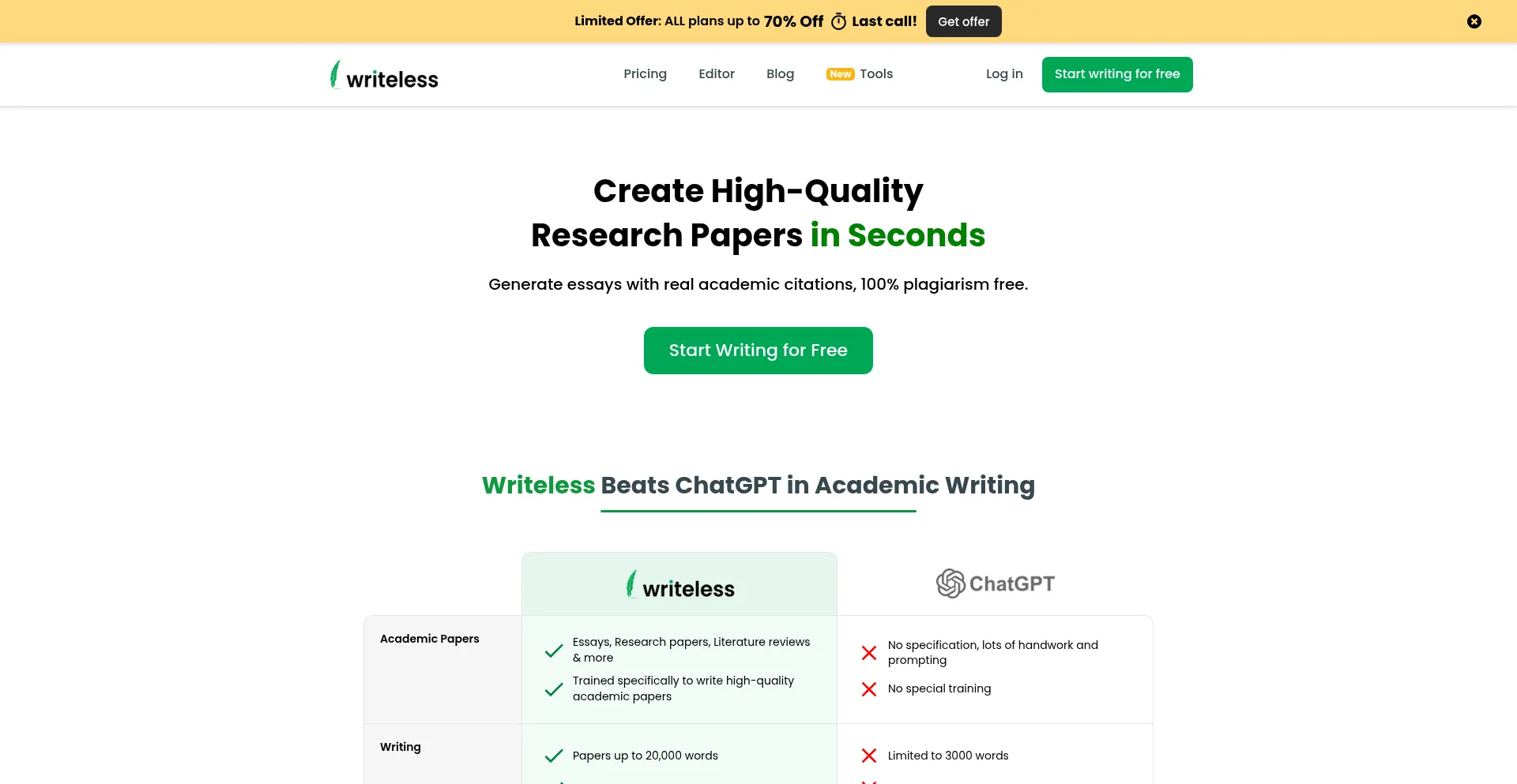 Writeless is the only AI essay writer which adds real academic citations, bypasses AI detectors, and writes like you.