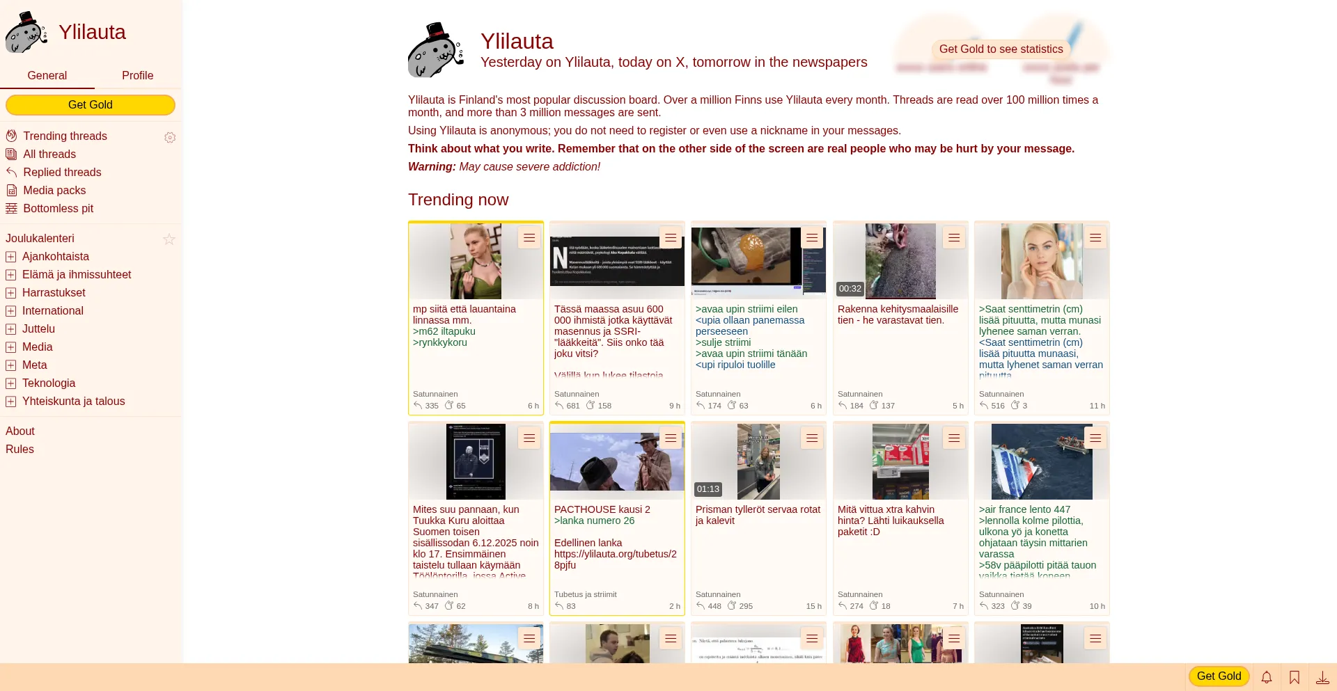 Ylilauta is an anonymous discussion board where you are free to discuss almost anything.